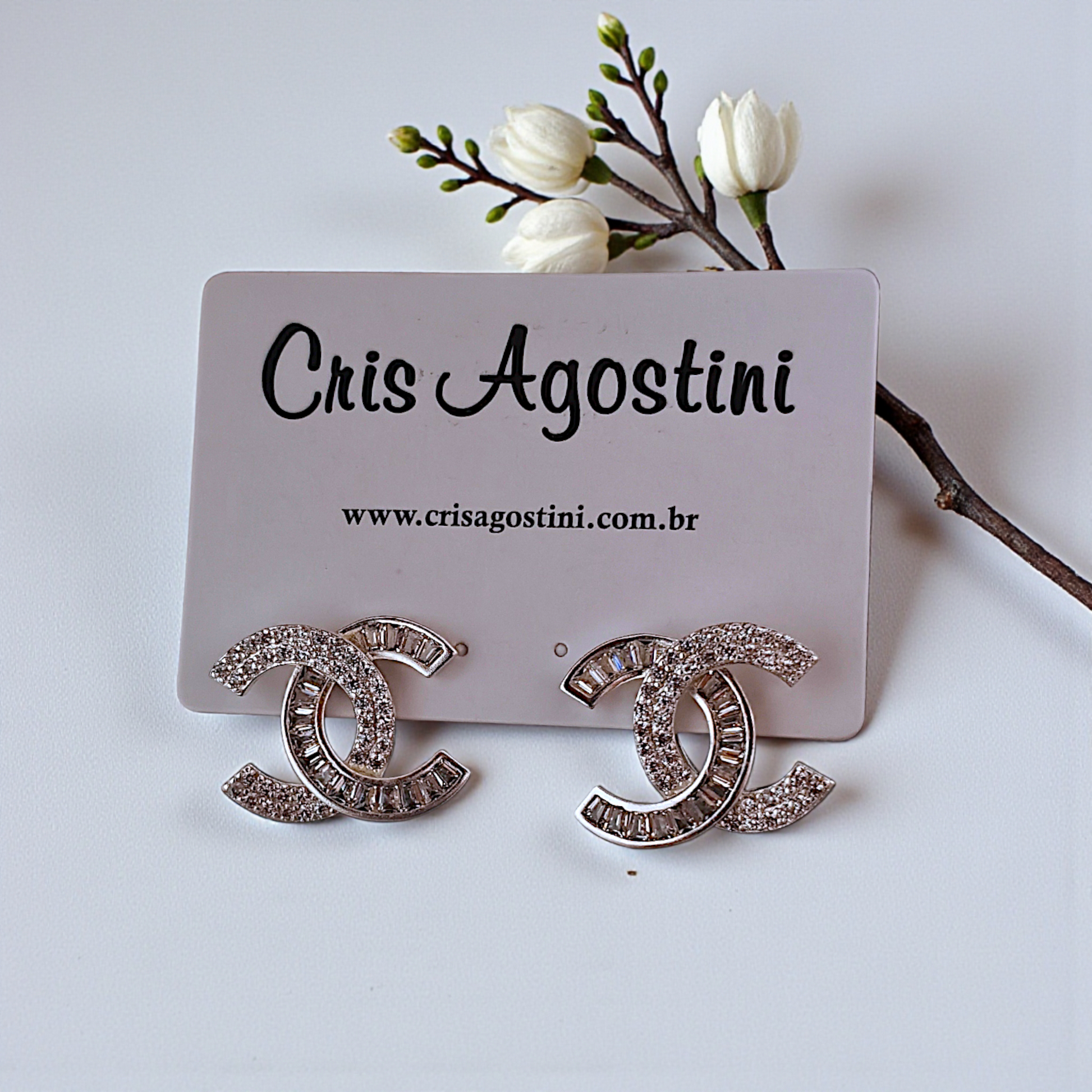 Brinco modelo chanel, cravejado com zircônias, banhado em Prata 925.