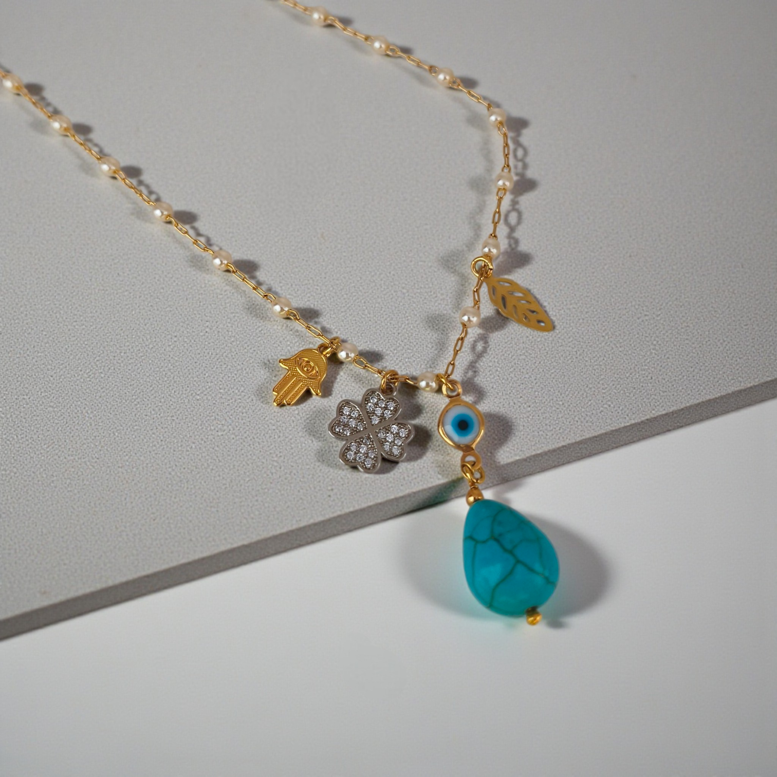 Colar Perolinhas, Pingentes da Sorte e Pedra Turquesa