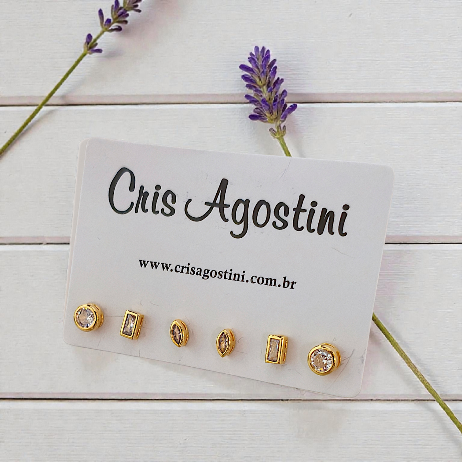 Trio Brincos Zircônia Círculo, Retângulo e Oval